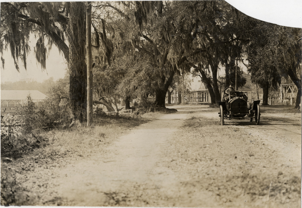 View of driver in car no. 1 traveling on tree-lined road during the 1908 Grand Prize races in Savannah, Georgia. Wooden-frame buildings in background. Handwritten on back: "Races and racing--Grand Prize races, 1908."