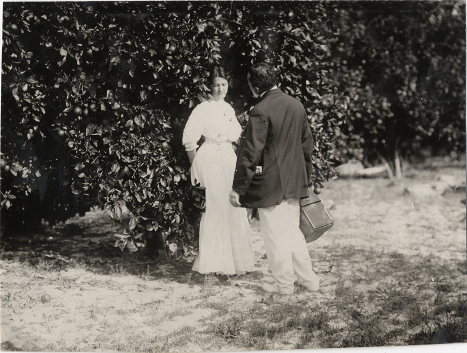 View of the photographer Nathan Lazarnick speaking with a woman in an orange grove during the 1908 Grand Prize races in Savannah, Georgia. Handwritten on back: "Races and racing--Grand Prize races, 1908."