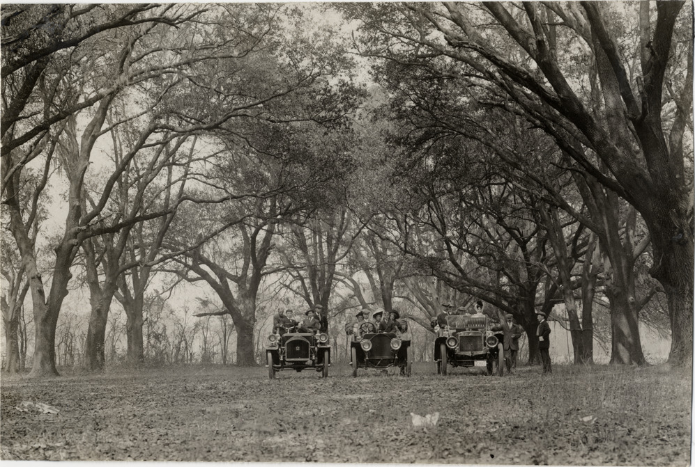View of motorists posing with three cars under grove of trees during the 1908 Grand Prize races in Savannah, Georgia. Handwritten on back: "Races and racing--Grand Prize races, 1908."