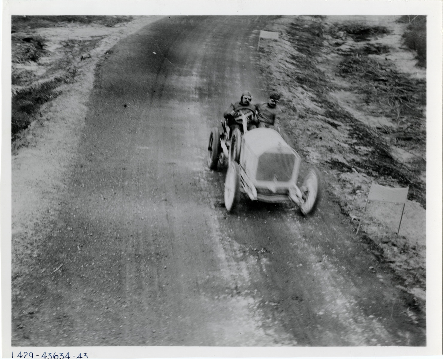 View of Rene Hanriot and passenger racing Benz car on course during the 1908 Grand Prize races in Savannah, Georgia. Handwritten on back: "Rene Hanriot in a Benz. Races and racing--Grand Prize races, 1908."