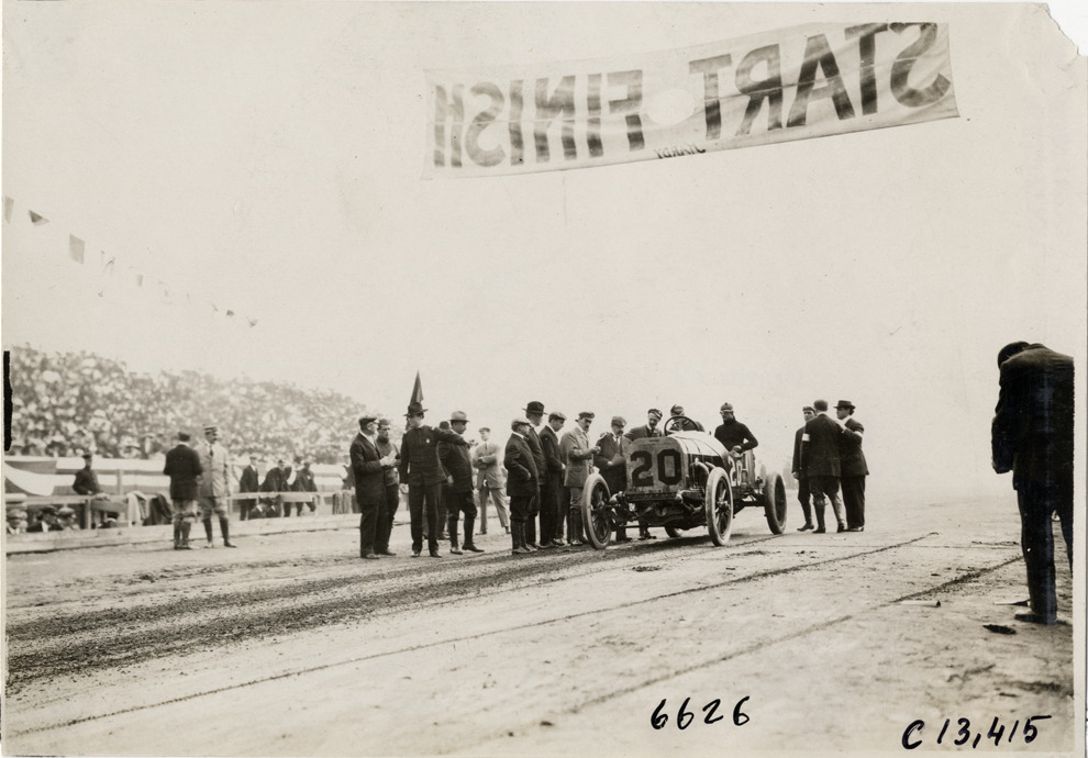 View of racing officials with car no. 20 at starting line during the 1908 Grand Prize races in Savannah, Georgia. "Start-Finish" banner is suspended overhead. Stamped on back: "Photo by N. Lazarnick, 29 West 42nd Street, N.Y., tel. 594 Bryant." Handwritten on back: "Races and racing--Grand Prize races, 1908."