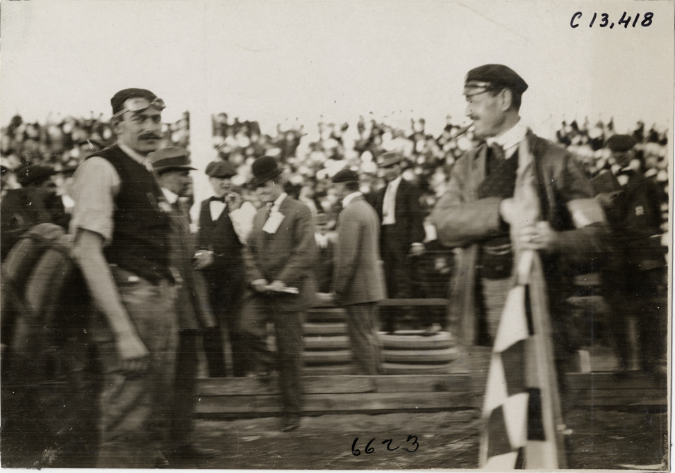 Favorite this☆ Fred Wagner and official, 1908 Grand Prize races Description: View of Fred Wagner and official holding checkered flag during the 1908 Grand Prize races in Savannah, Georgia. Spectators in background. Handwritten on back: "Races and racing--Grand Prize races, 1908." Details Resource ID: na012752 Subject: Sports officials--Georgia--Savannah Automobile racing--Georgia--Savannah Photographic prints Date Issued: 1908 Format: 1 photographic print ; 4.5 x 6.5 in. Member of: National Automotive History Collection Lazarnick Collection Filing Location: Races and racing--Grand Prize Races, 1908 #8 Negative Number: Negative #C13,418 Rights: Physical rights are retained by DPL. Copyright is retained in accordance with U.S. copyright laws.