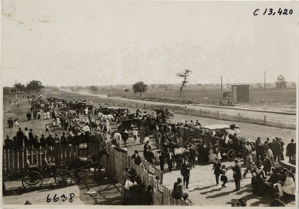Favorite this☆ Spectators, 1908 Grand Prize races Description: Bird's-eye view of spectators on roadside during the 1908 Grand Prize races in Savannah, Georgia. Cars are parked along road; fence and horse-drawn carriage in foreground. Handwritten on back: "Races and racing--Grand Prize races, 1908." Details Resource ID: na012754 Subject: Automobile racing fans--Georgia--Savannah Horse-drawn vehicles--Georgia--Savannah Automobile racing--Georgia--Savannah Photographic prints Date Issued: 1908 Format: 1 photographic print ; 4.75 x 6.75 in. Member of: National Automotive History Collection Lazarnick Collection Filing Location: Races and racing--Grand Prize Races, 1908 #8 Negative Number: Negative #C13,420 Rights: Physical rights are retained by DPL. Copyright is retained in accordance with U.S. copyright laws.