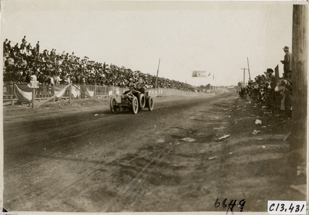 Driver and passenger in racecar, 1908 Grand Prize races