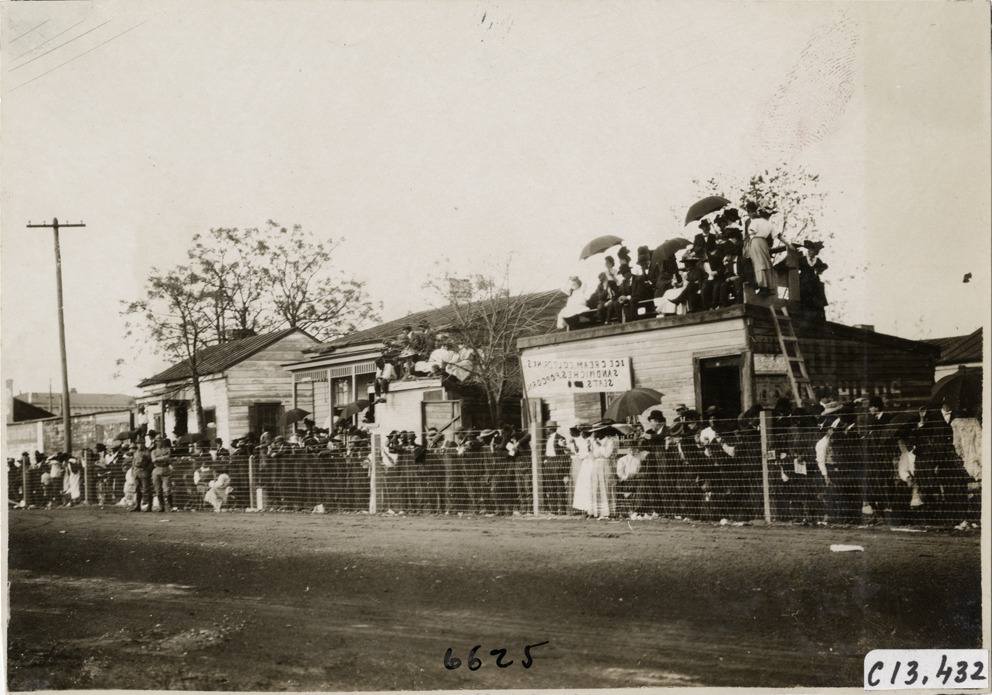 View of spectators standing behind fence in front of wooden-frame buildings during the 1908 Grand Prize races in Savannah, Georgia. Group of men and women watch race from roof of building on right. Handwritten on back: "Races and racing--Grand Prize races, 1908."