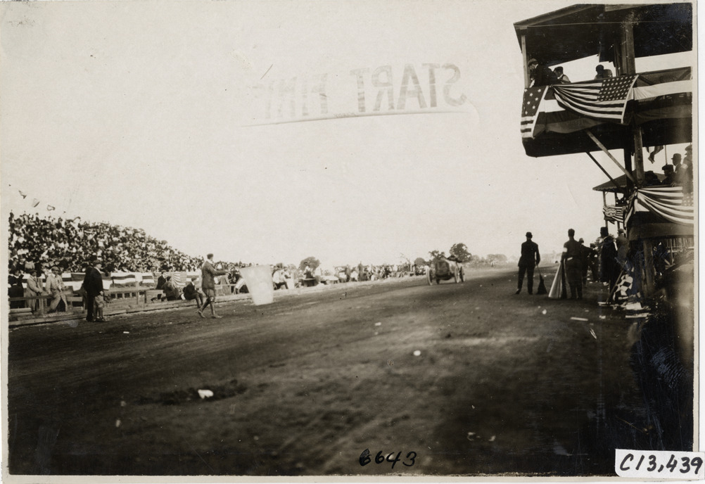 Racecar approaching finish line, 1908 Grand Prize races