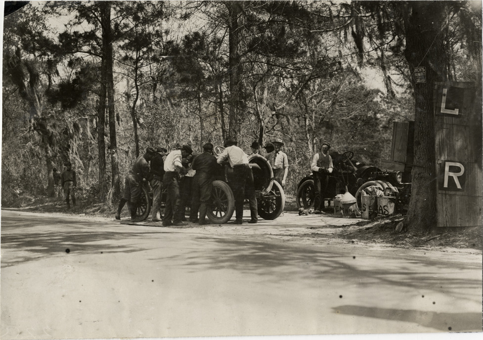 View of men working on Apperson car at Apperson Camp during the 1908 Grand Prize races in Savannah, Georgia. Handwritten on back: "Apperson camp. Races and racing--Grand Prize races, 1908."