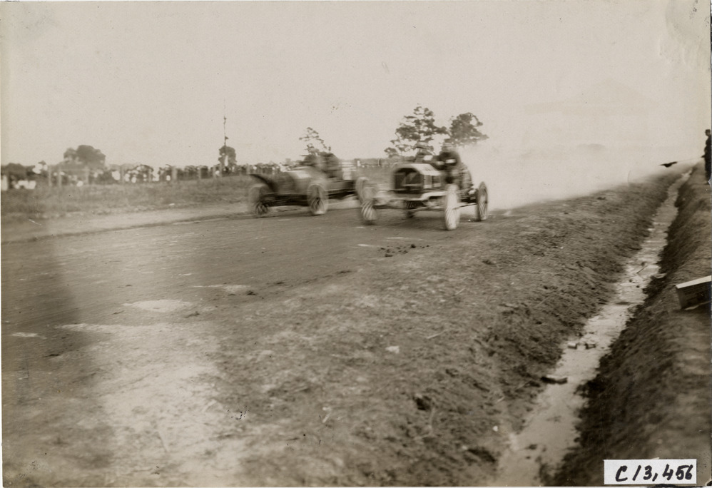 Favorite this☆ Automobile race, 1908 Grand Prize races Description: View of two cars racing on course during the 1908 Grand Prize races in Savannah, Georgia. Handwritten on back: "Races and racing--Grand Prize races, 1908." Details Resource ID: na012782 Subject: Automobiles, Racing--Georgia--Savannah Automobile racing--Georgia--Savannah Photographic prints Date Issued: 1908 Format: 1 photographic print ; 4.75 x 6.75 in. Member of: National Automotive History Collection Lazarnick Collection Filing Location: Races and racing--Grand Prize Races, 1908 #9 Negative Number: Negative #C13,456 Rights: Physical rights are retained by DPL. Copyright is retained in accordance with U.S. copyright laws.