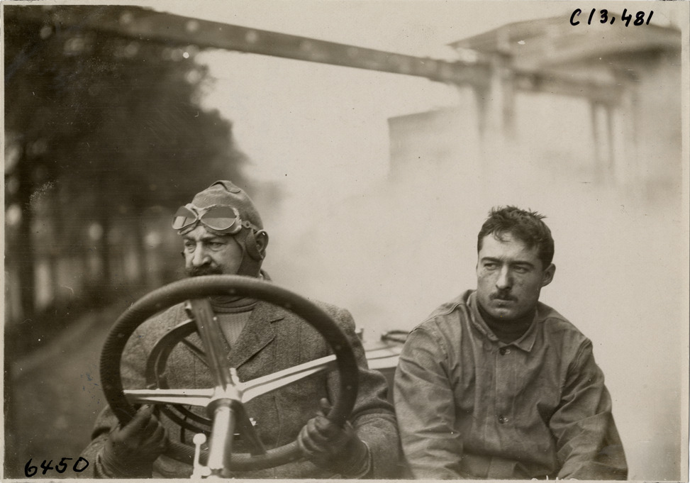 Henri Fournier and passenger in racecar, 1908 Grand Prize races