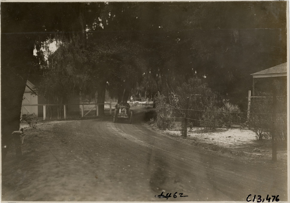 View of driver and passenger racing car on course during the 1908 Grand Prize races in Savannah, Georgia. Stamped on back: "Photo by N. Lazarnick, 29 West 42nd Street, N.Y., tel. 594 Bryant." Handwritten on back: "Races and racing--Grand Prize races, 1908."