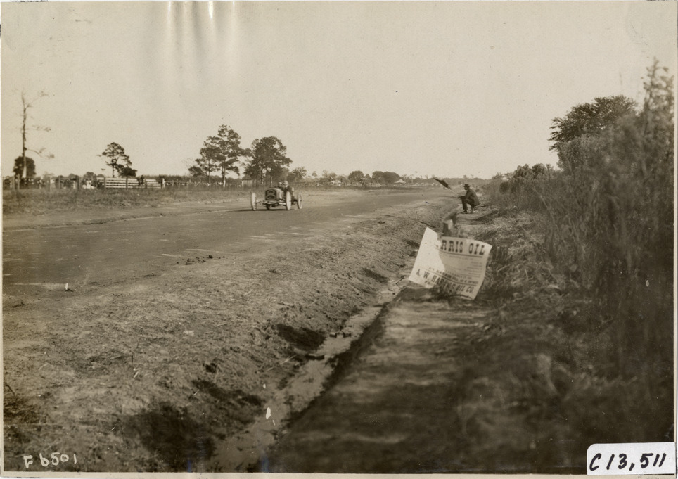 View of driver and passenger racing Buick car no. 8 on course during the 1908 Grand Prize races in Savannah, Georgia. "Harris Oil" sign tacked to post; official waves flag on roadside. Stamped on back: "Photo by N. Lazarnick, 29 West 42nd Street, N.Y., tel. 594 Bryant." Handwritten on back: "Buick approaching grandstand. Races and racing--Grand Prize races, 1908."