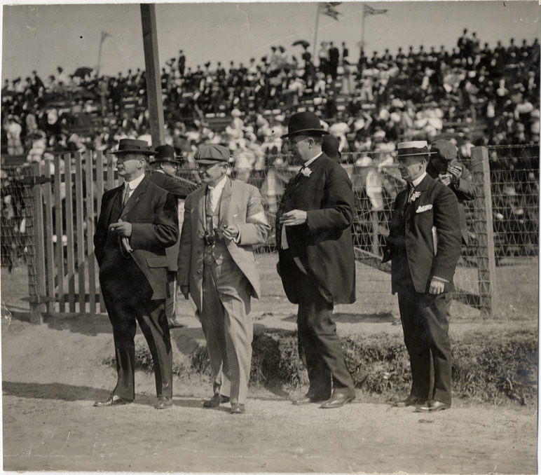 View of Hoke Smith, Governor of Georgia, Frank Battey, President of the Savannah Automobile Club, and two unidentified men during the 1908 Grand Prize races in Savannah, Georgia. Handwritten on back: "Gov. Hock [sic] Smith, Pres. Battey. Races and racing--Grand Prize races, 1908."