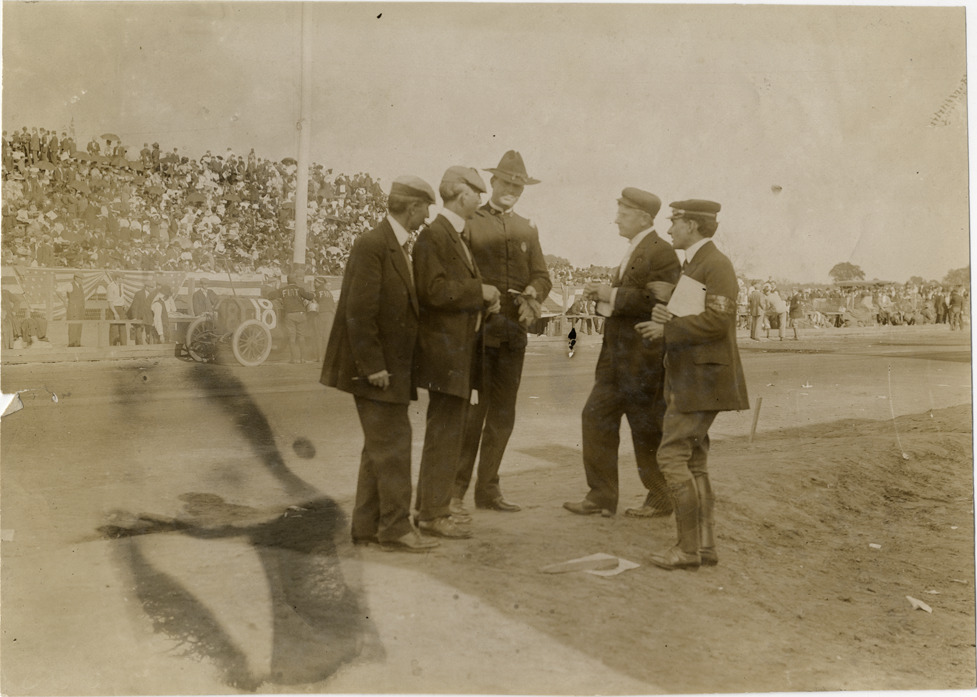 Soldier conversing with racing officials, 1908 Grand Prize races