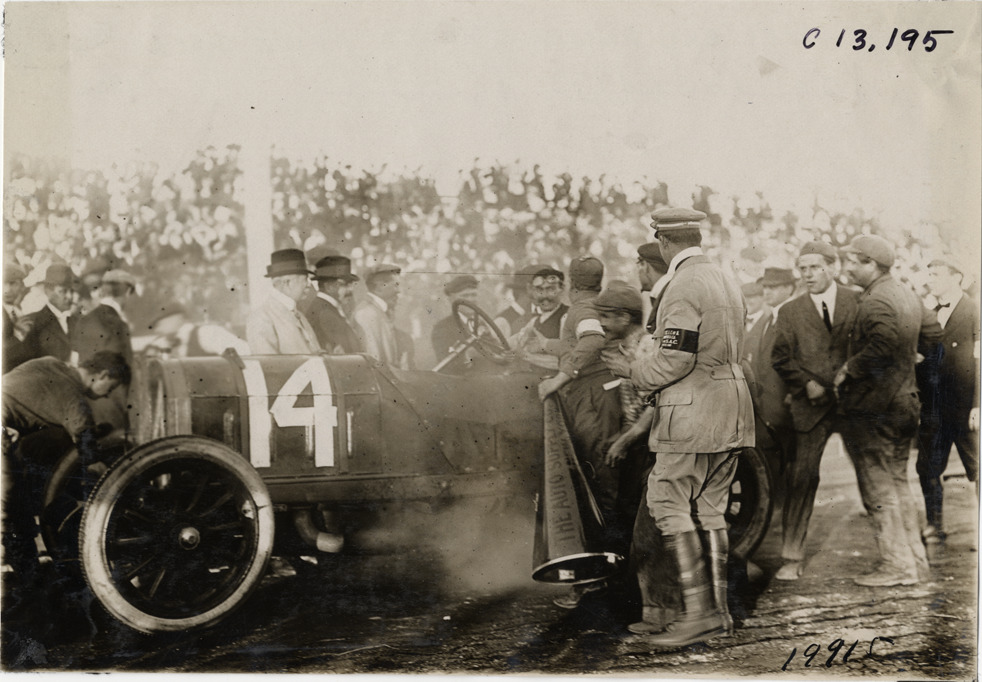 View of Louis Wagner in Fiat car no. 14 after finish during the 1908 Grand Prize races in Savannah, Georgia. Racing officials and announcer with megaphone surround car. Stamped on back: "Photo by N. Lazarnick, 29 West 42nd Street, N.Y., tel. 594 Bryant." Handwritten on back: "Wagner after finish. Races and racing--Grand Prize races, 1908."