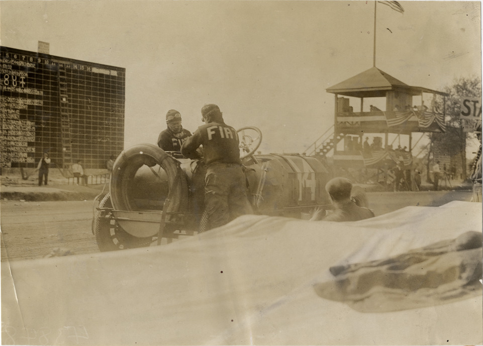 Men working on Fiat racecar, 1908 Grand Prize races