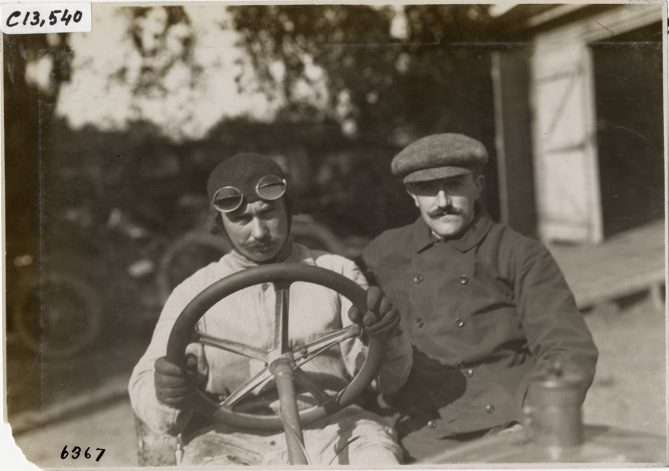 Close-up view of driver and passenger in racecar during the 1908 Grand Prize races in Savannah, Georgia. Stamped on back: "Photo by N. Lazarnick, 29 West 42nd Street, N.Y., tel. 594 Bryant." Handwritten on back: "Races and racing--Grand Prize races, 1908."
