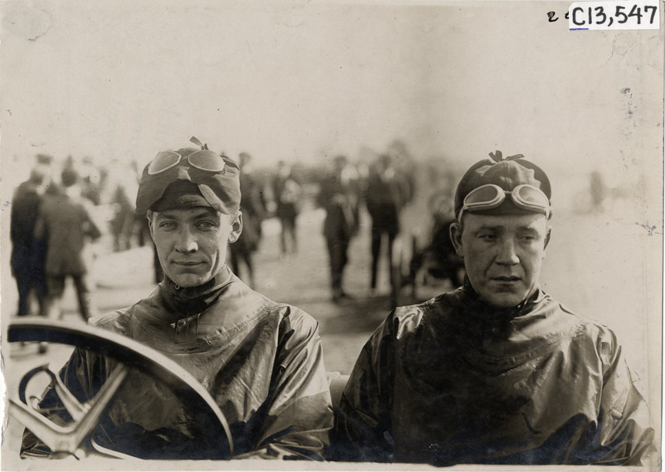 Close-up view of driver and passenger in racecar during the 1908 Grand Prize races in Savannah, Georgia. Stamped on back: "Photo by N. Lazarnick, 29 West 42nd Street, N.Y., tel. 594 Bryant." Handwritten on back: "Races and racing--Grand Prize races, 1908."