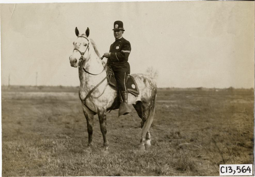 View of police officer on horseback during the 1908 Grand Prize races in Savannah, Georgia. Stamped on back: "Photo by N. Lazarnick, 29 West 42nd Street, N.Y., tel. 594 Bryant." Handwritten on back: "Mounted cop on duty on course. Races and racing--Grand Prize races, 1908."