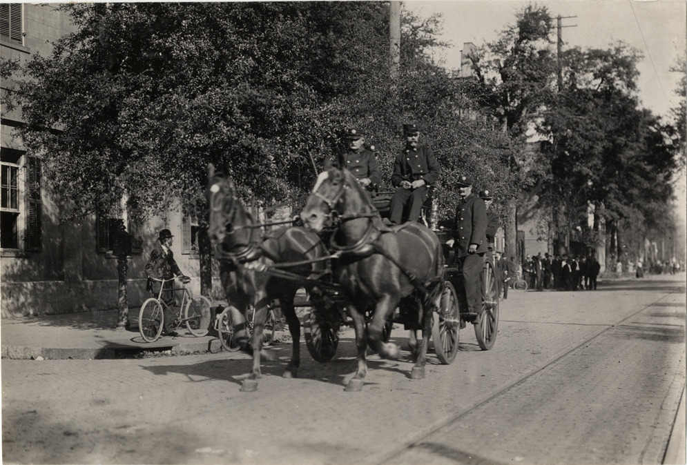 View of firemen from Savannah Fire Department on horse-drawn fire engine during the 1908 Grand Prize races in Savannah, Georgia. Man with bicycle stands on side of street. Handwritten on back: "Savannah Fire Dept. Races and racing--Grand Prize races, 1908."