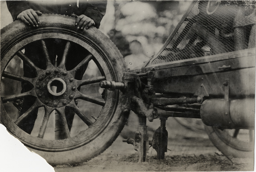 Man changing wheel on Renault racecar, 1908 Grand Prize races