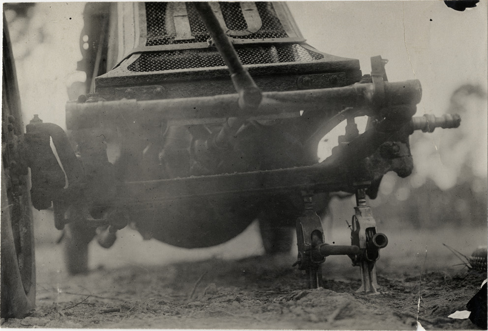 Close-up view of jack under Renault car during the 1908 Grand Prize races in Savannah, Georgia. Handwritten on back: "Changing Renault wheel. Races and racing--Grand Prize races, 1908."