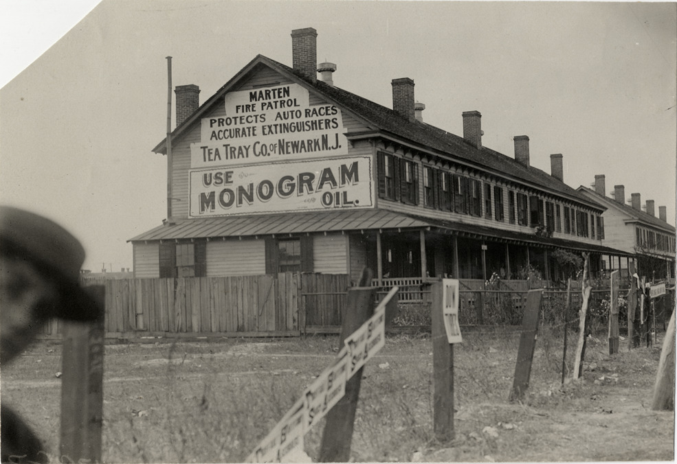 View of signs for Monogram oil and the Tea Tray Co. displayed on side of wooden-frame building during the 1908 Grand Prize races in Savannah, Georgia. "Marten Fire Patrol protects auto races, accurate fire extinguishers, Tea Tray Co. of Newark, N.J.; Use Monogram oil" printed on signs. Handwritten on back: "Races and racing--Grand Prize races, 1908."