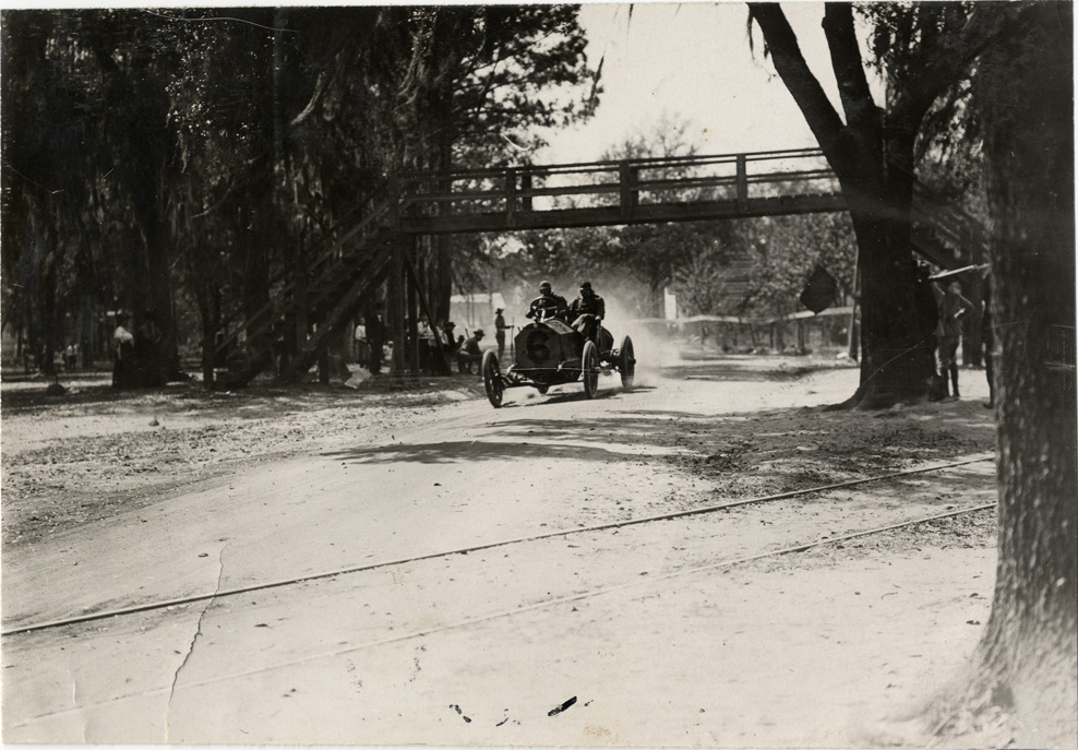 View of Al Poole and passenger driving Isotta-Fraschini car no. 6 under pedestrian bridge during the 1908 Grand Prize races in Savannah, Georgia. Handwritten on back: "Isotta record lap, Poole. Races and racing--Grand Prize races, 1908."