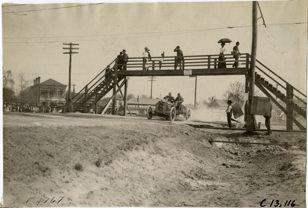 Racecar passing under pedestrian bridge, 1908 Grand Prize races