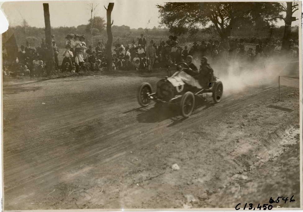 Driver and passenger in racecar, 1908 Grand Prize races