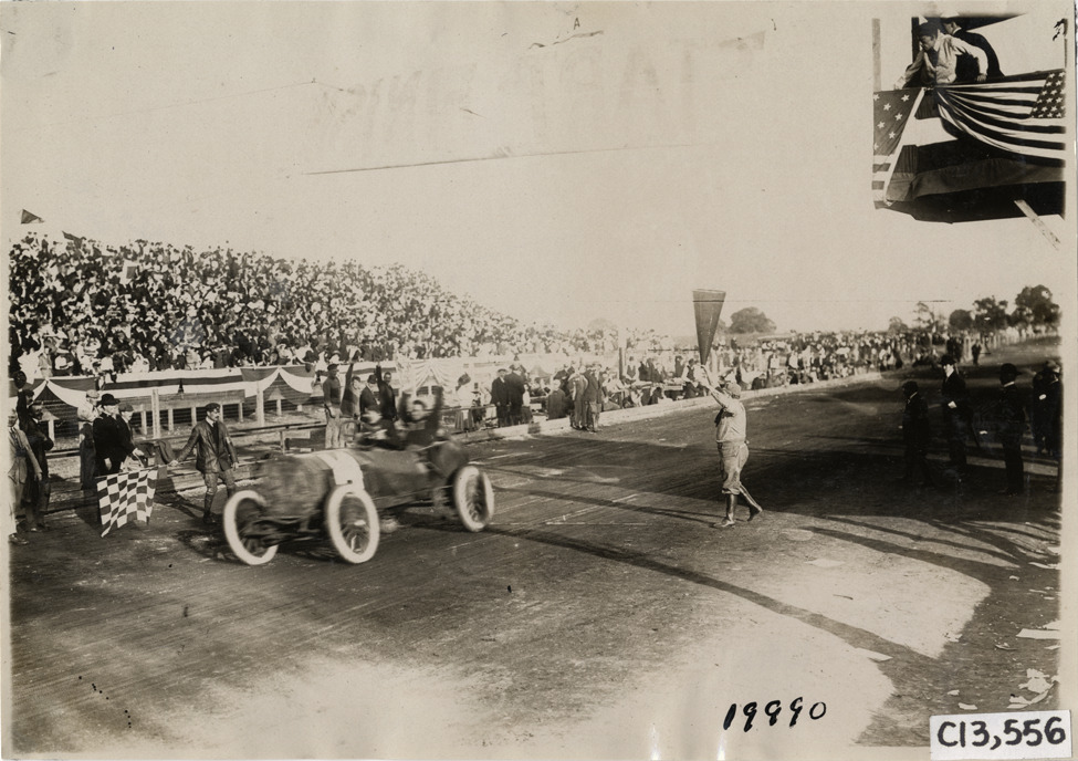 Louis Wagner crossing finish line in Fiat racecar, 1908 Grand Prize races