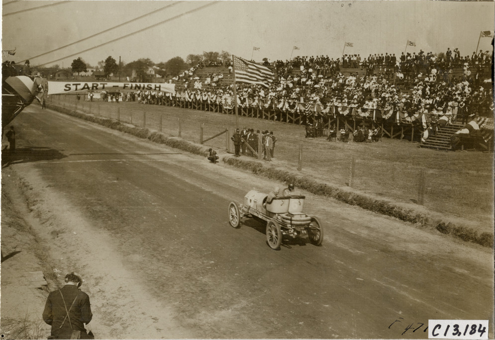 Rear view of driver and passenger in Thomas-Detroit car passing spectators in stands during the 1908 Grand Prize races in Savannah, Georgia. American flag is displayed at side of course; "Start-Finish" banner is suspended over road. Stamped on back: "Photo by N. Lazarnick, 29 West 42nd Street, N.Y., tel. 594 Bryant." Handwritten on back: "Thomas-Detroit passing grand stand. Races and racing--Grand Prize races, 1908."