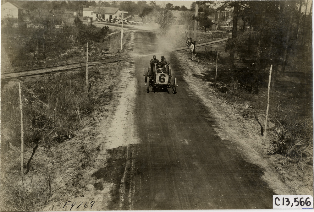 View of driver and passenger racing car no. 6 on course during the 1908 Grand Prize races in Savannah, Georgia. Railroad crossing in background. Stamped on back: "Photo by N. Lazarnick, 29 West 42nd Street, N.Y., tel. 594 Bryant." Handwritten on back: "At Sand [undecipherable]. Races and racing--Grand Prize races, 1908."
