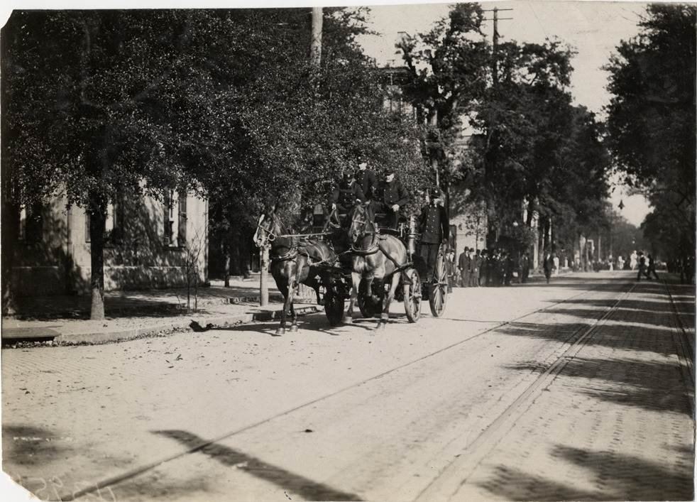 View of firemen from Savannah Fire Department on horse-drawn fire engine during the 1908 Grand Prize races in Savannah, Georgia. Stamped on back: "Spooner & Wells, Inc., photographers, telephones 3472-3473 Columbus, 1931 Broadway, New York." Handwritten on back: "Savannah Fire Dept. Races and racing--Grand Prize races, 1908."