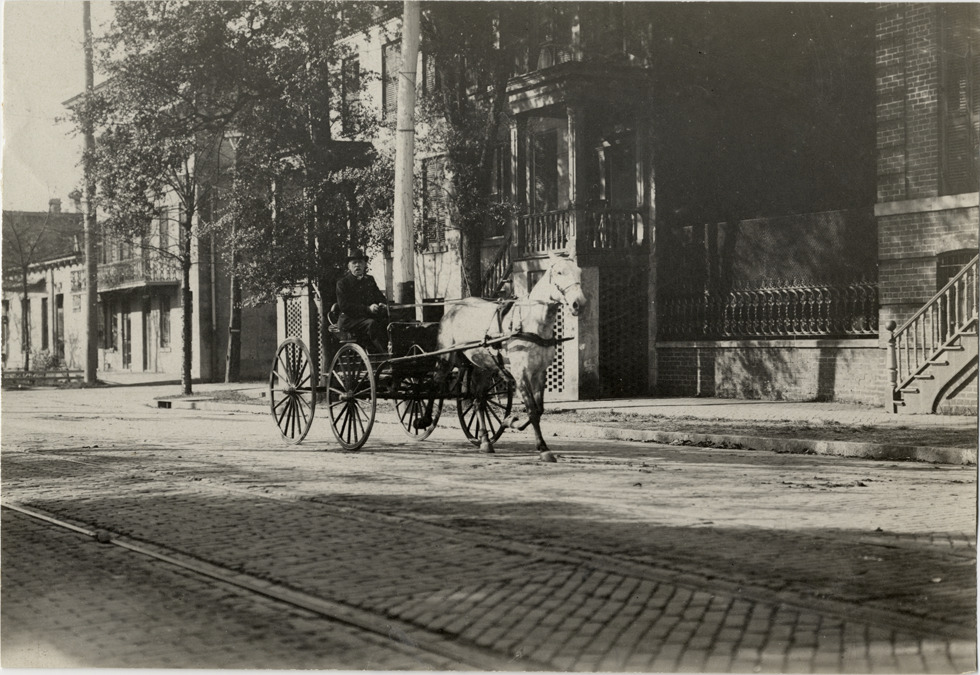 View of superintendent of Savannah Fire Department driving horse-drawn carriage during the 1908 Grand Prize races in Savannah, Georgia. Stamped on back: "Spooner & Wells, Inc., photographers, telephones 3472-3473 Columbus, 1931 Broadway, New York." Handwritten on back: "Supt., Savannah Fire Dept. Races and racing--Grand Prize races, 1908."