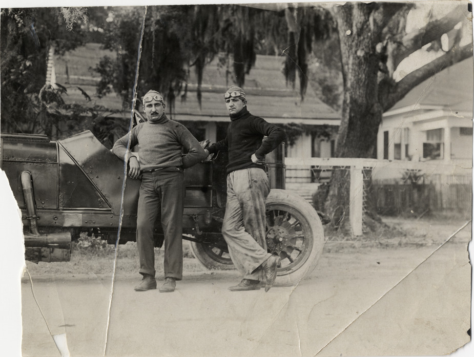 View of driver Giovanni Piacenza and unidentified man posing with racecar during the 1908 Grand Prize races in Savannah, Georgia. Stamped on back: "Spooner & Wells, Inc., photographers, telephones 3472-3473 Columbus, 1931 Broadway, New York." Handwritten on back: "Races and racing--Grand Prize races, 1908."
