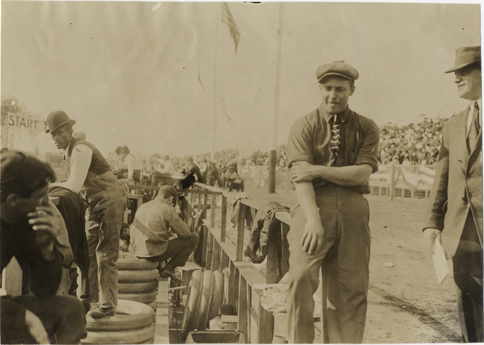 View of driver George Robertson standing next to men in pits during the 1908 Grand Prize races in Savannah, Georgia. Stamped on back: "Spooner & Wells, Inc., photographers, telephones 3472-3473 Columbus, 1931 Broadway, New York." Handwritten on back: "Geo. Robertson. Races and racing--Grand Prize races, 1908."