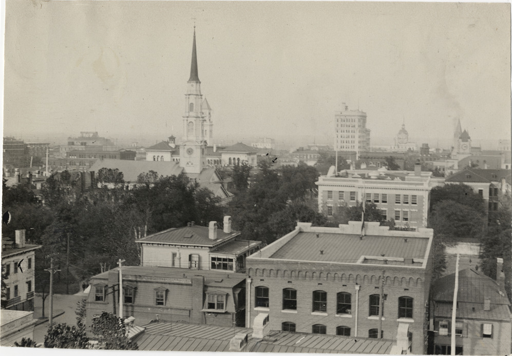 Bird's-eye view of Savannah, Georgia during the 1908 Grand Prize races. Church spire in background. Stamped on back: "Spooner & Wells, Inc., photographers, telephones 3472-3473 Columbus, 1931 Broadway, New York." Handwritten on back: "Races and racing--Grand Prize races, 1908."