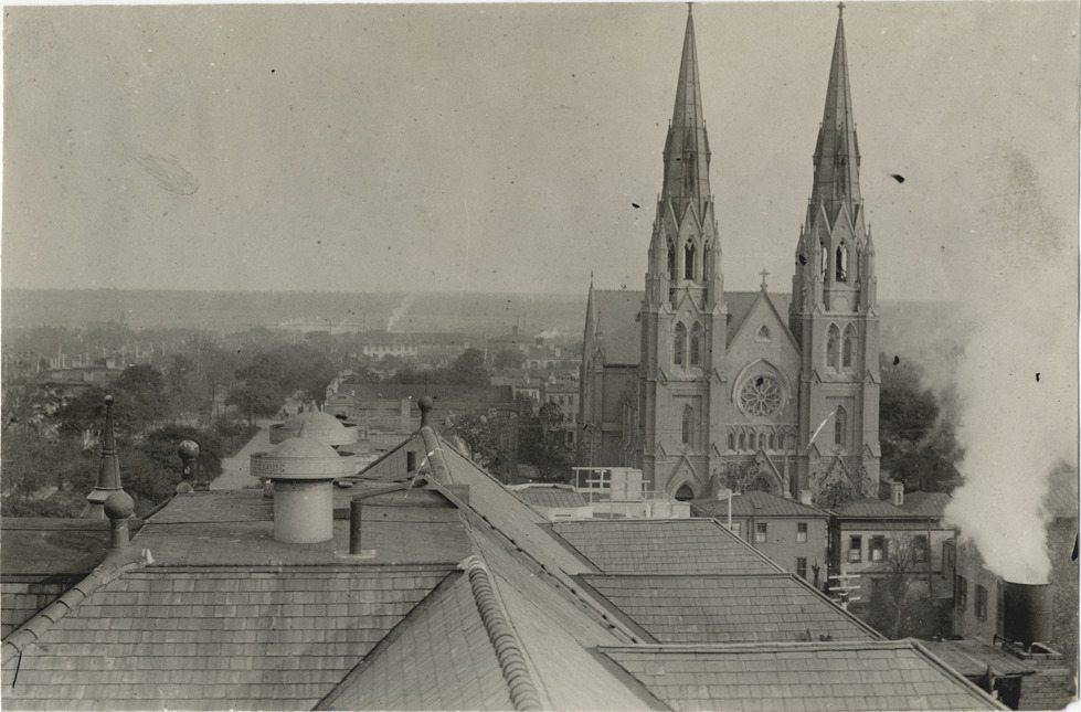 Aerial view of Cathedral of St. John the Baptist during the 1908 Grand Prize races in Savannah, Georgia. Rooftops in foreground. Stamped on back: "Spooner & Wells, Inc., photographers, telephones 3472-3473 Columbus, 1931 Broadway, New York." Handwritten on back: "Races and racing--Grand Prize races, 1908."