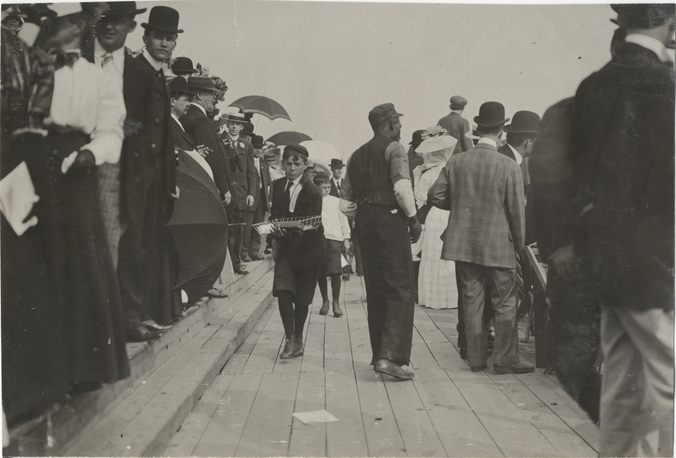 View of spectators in grandstand during the 1908 Grand Prize races in Savannah, Georgia. Boy carrying wire basket walks in foreground. Stamped on back: "Spooner & Wells, Inc., photographers, telephones 3472-3473 Columbus, 1931 Broadway, New York." Handwritten on back: "The promenade in grandstand, White Isle. Races and racing--Grand Prize races, 1908."