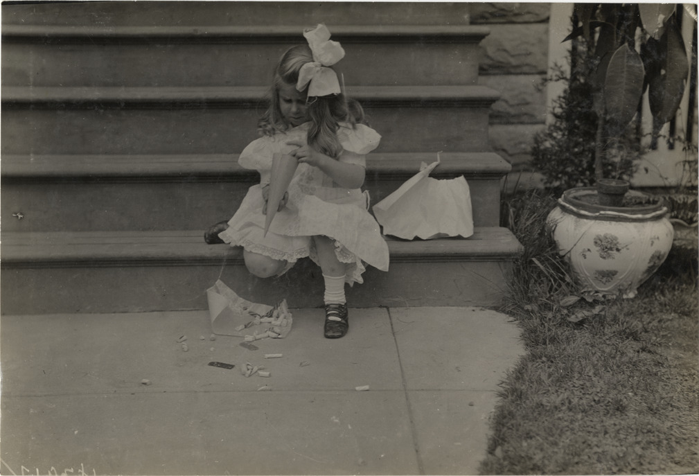View of young girl sitting on steps and holding a paper cone filled with candy during the 1908 Grand Prize races in Savannah, Georgia. Stamped on back: "Spooner & Wells, Inc., photographers, telephones 3472-3473 Columbus, 1931 Broadway, New York." Handwritten on back: "Races and racing--Grand Prize races, 1908."