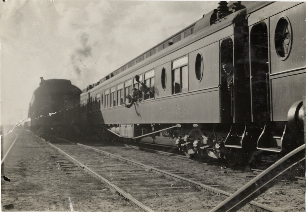 Men waving from windows of railroad passenger car, 1908 Grand Prize races