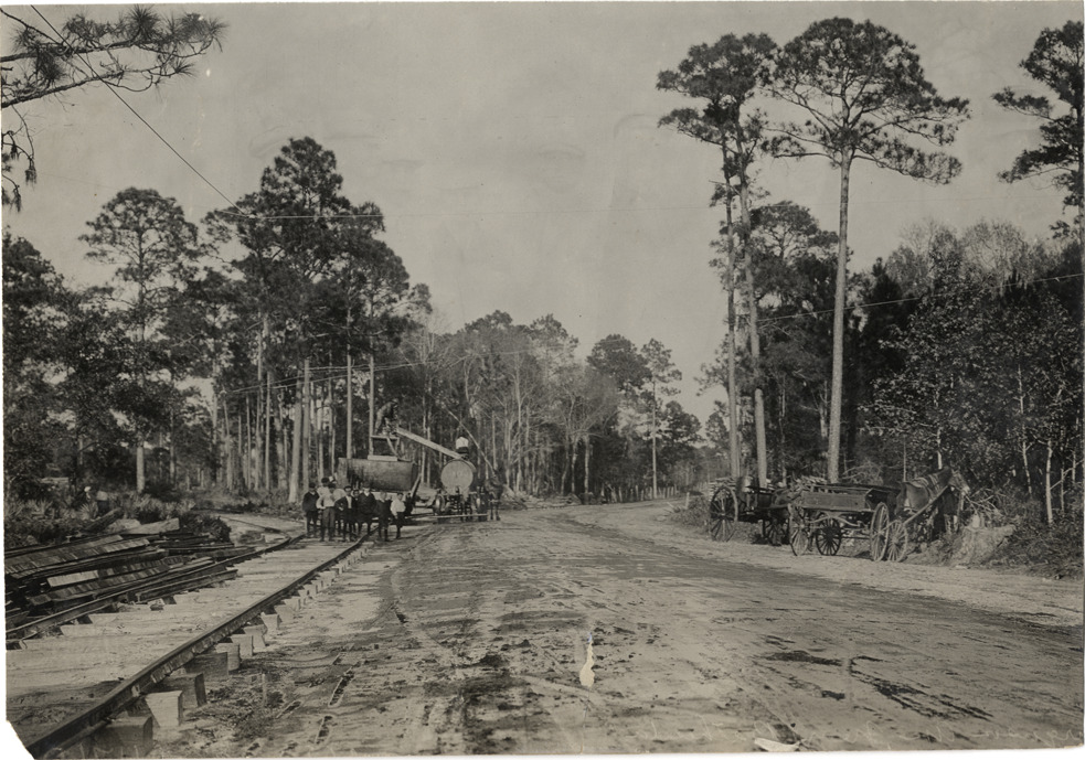 View of railroad construction workers posing on railroad tracks during the 1908 Grand Prize races in Savannah, Georgia. Machinery in background; two horse-drawn wagons on roadside. Handwritten on back: "Races and racing--Grand Prize races, 1908."