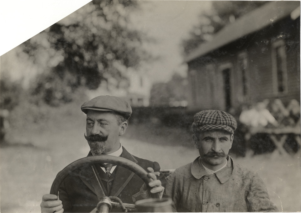 Lucien Hautvast and passenger in racecar, 1908 Grand Prize races
