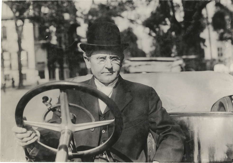 Close-up view of Frank C. Battey, president of the Savannah Automobile Club, posing in car during the 1908 Grand Prize races in Savannah, Georgia. Handwritten on back: "Races and racing--Grand Prize races, 1908."