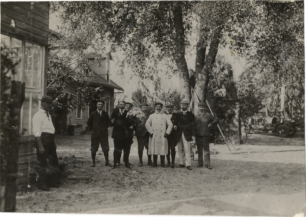 View of drivers Lucien Hautvast and Victor Rigal posing with group of unidentified men under a tree during the 1908 Grand Prize races in Savannah, Georgia. Wooden-frame house and racecar in background. Stamped on back: "Spooner & Wells, Inc., photographers, telephones 3472-3473 Columbus, 1931 Broadway, New York." Handwritten on back: "Races and racing--Grand Prize races, 1908."