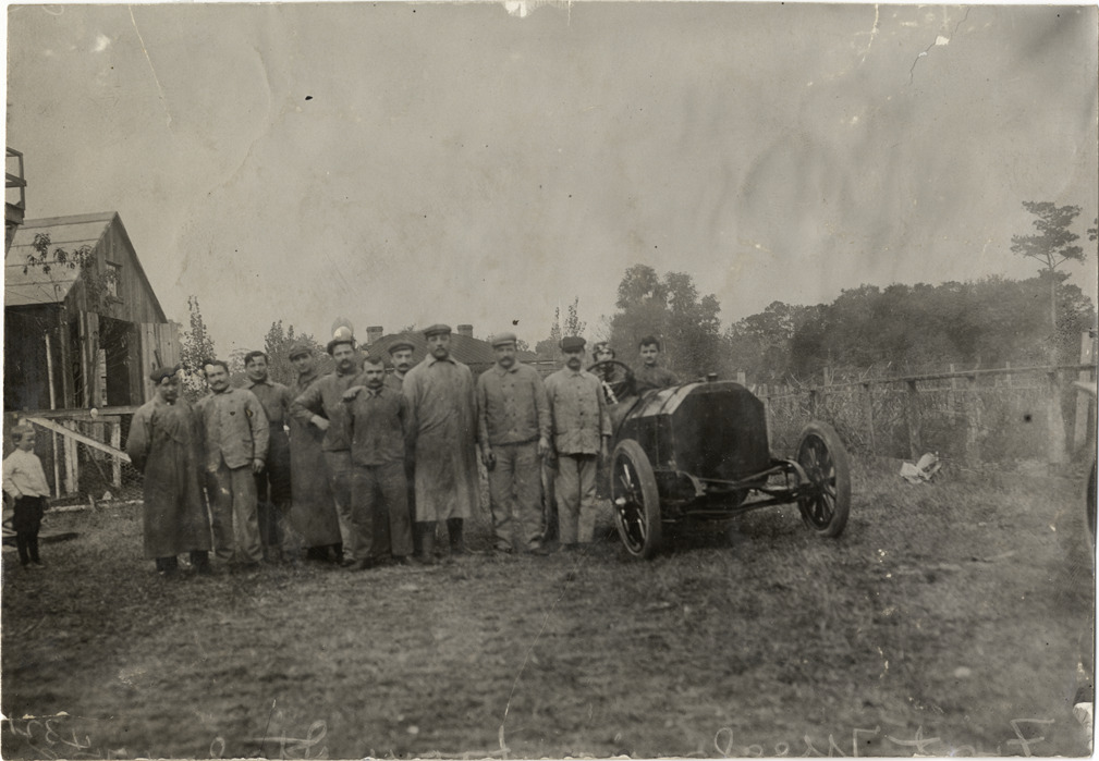 Fiat racing team with racecar, 1908 Grand Prize races
