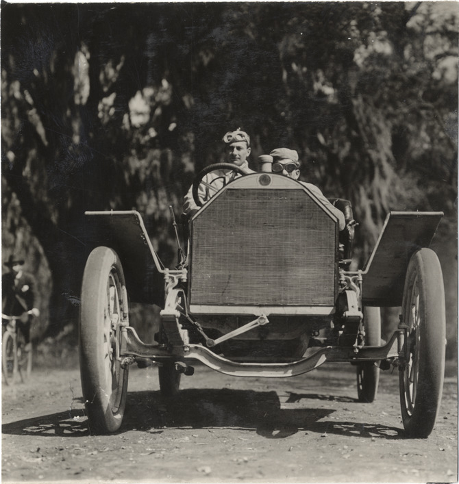Front view of L.B. Lorimer and Boulger in Thomas-Detroit car during the 1908 Grand Prize races in Savannah, Georgia. Handwritten on back: "Thomas-Detroit, Lorimer & Boulger. Races and racing--Grand Prize races, 1908."