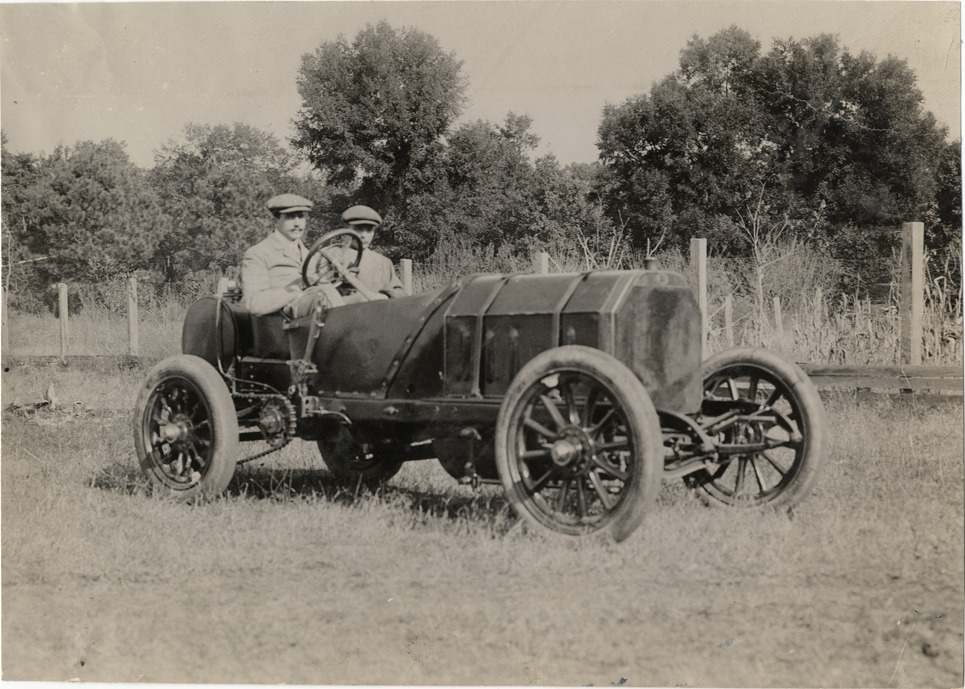 Driver and passenger in racecar, 1908 Grand Prize races