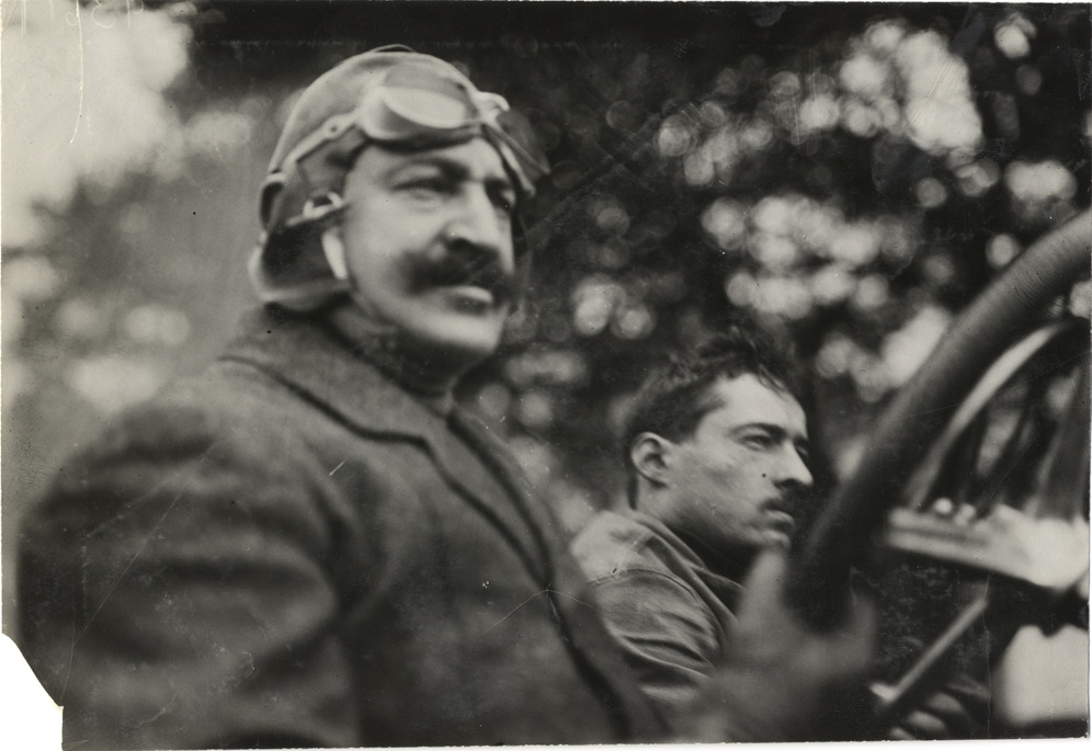 Henri Fournier and passenger in racecar, 1908 Grand Prize races