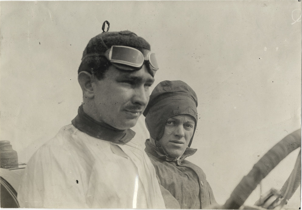 Close-up view of driver Bob Burman and passenger in racecar during the 1908 Grand Prize races in Savannah, Georgia. Stamped on back: "Spooner & Wells, Inc., photographers, telephones 3472-3473 Columbus, 1931 Broadway, New York." Handwritten on back: "Bob Burman. Races and racing--Grand Prize races, 1908."